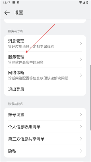 3、在設(shè)置界面中找到服務(wù)管理選項,點擊該選項進(jìn)入服務(wù)管理。