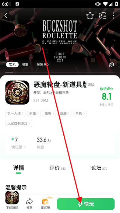 4、最后,在詳情頁最下方點擊【快玩】,這樣無需下載即可體驗游戲。