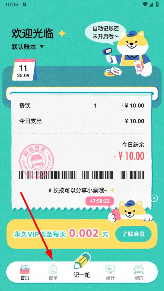 1、打開阿柴記賬應(yīng)用,點擊底部導(dǎo)航欄中的賬單選項,進(jìn)入賬單查看界面。