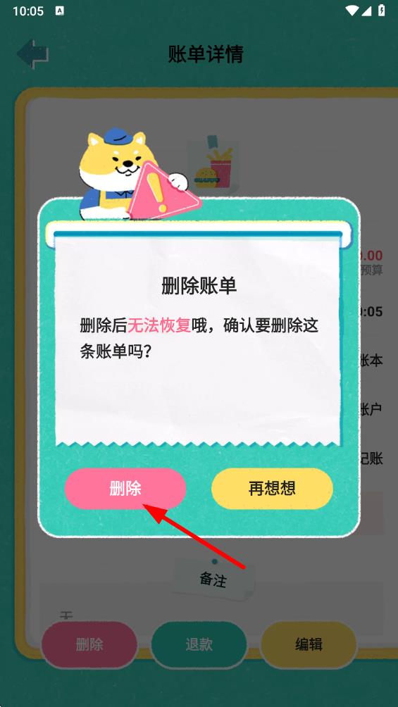 4、在彈出的確認(rèn)刪除提示框中,再次點擊刪除,即可成功刪除該筆賬單。