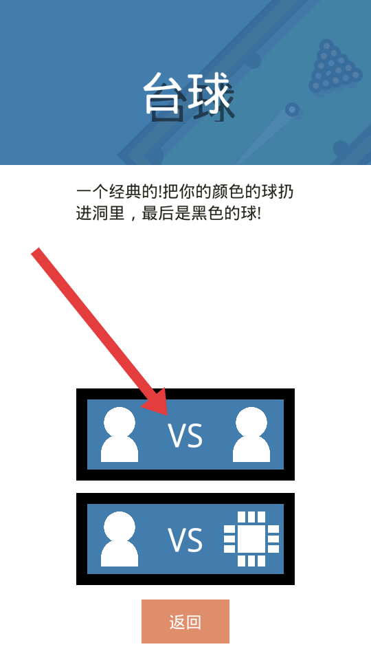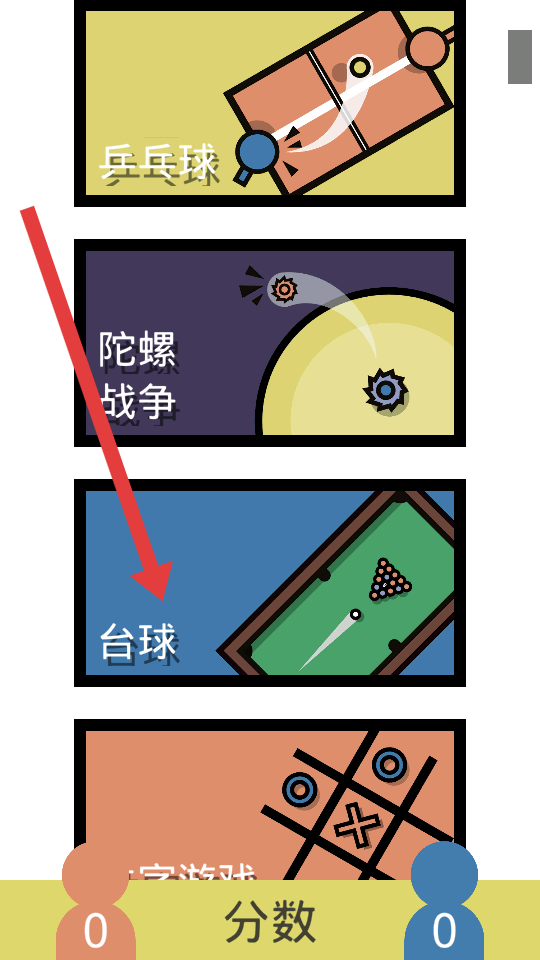 1、在游戲列表界面中,選擇喜歡的模式,可以選擇顯示臺球桌畫面的臺球游戲選項(xiàng),點(diǎn)擊它進(jìn)入臺球游戲?qū)倌J健?