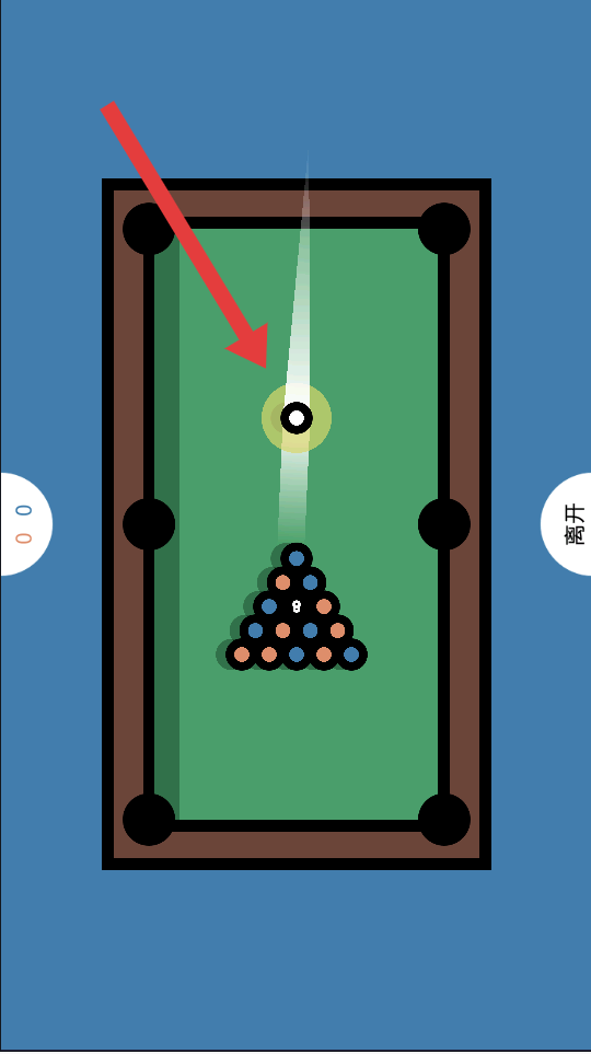 3、加載進(jìn)入臺球桌游戲界面,通過滑動屏幕或點(diǎn)擊操作調(diào)整球桿角度與發(fā)力,瞄準(zhǔn)目標(biāo)后擊打母球,正式開始臺球游戲。