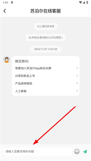 3、進(jìn)入蘇泊爾在線客服頁面后,在底部輸入框輸入要咨詢的問題,即可與客服溝通。