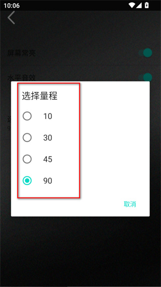 4、在量程選擇頁面,可選擇10、30、45、90等量程選項,根據(jù)需求選擇后即可使用對應量程的水平測量功能。