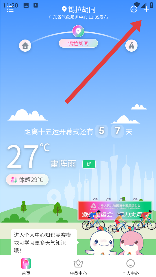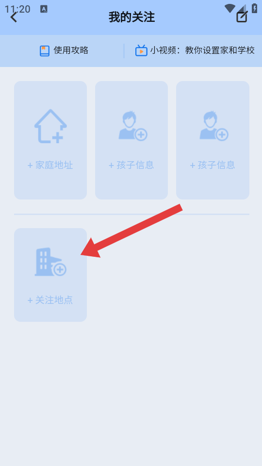 2、在我的關(guān)注頁面,點擊+關(guān)注地點選項,進入搜索地址界面。