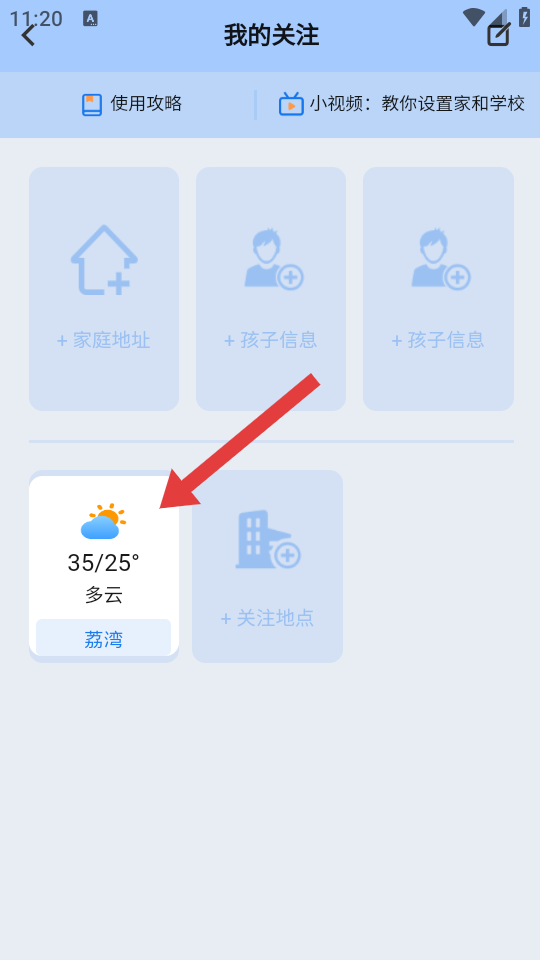 4、選擇地點后,返回我的關(guān)注頁面,即可看到該地點的天氣信息卡片,完成地點關(guān)注。