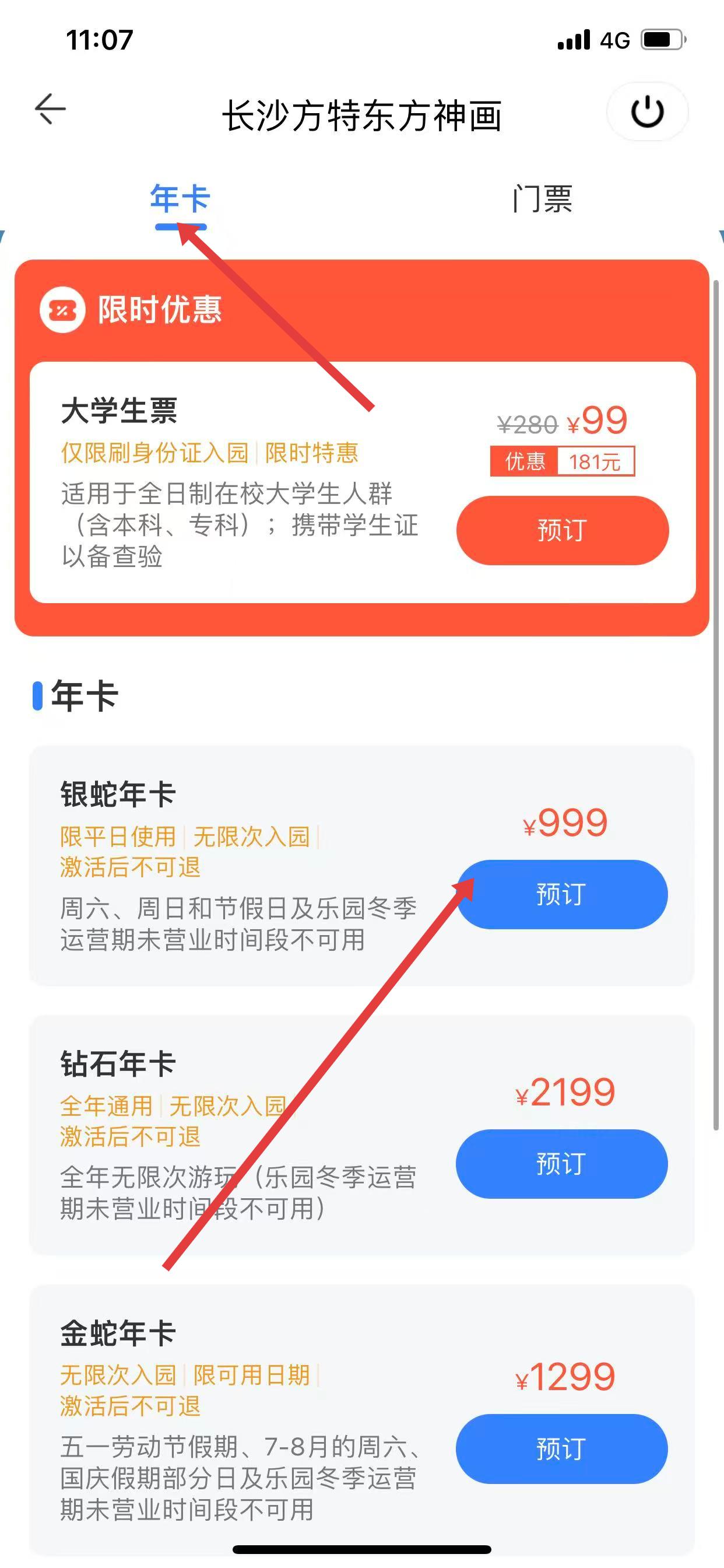 2、進(jìn)入年卡頁(yè)面后,選擇你想購(gòu)買(mǎi)的年卡類(lèi)型,比如銀蛇年卡,點(diǎn)擊預(yù)訂按鈕。