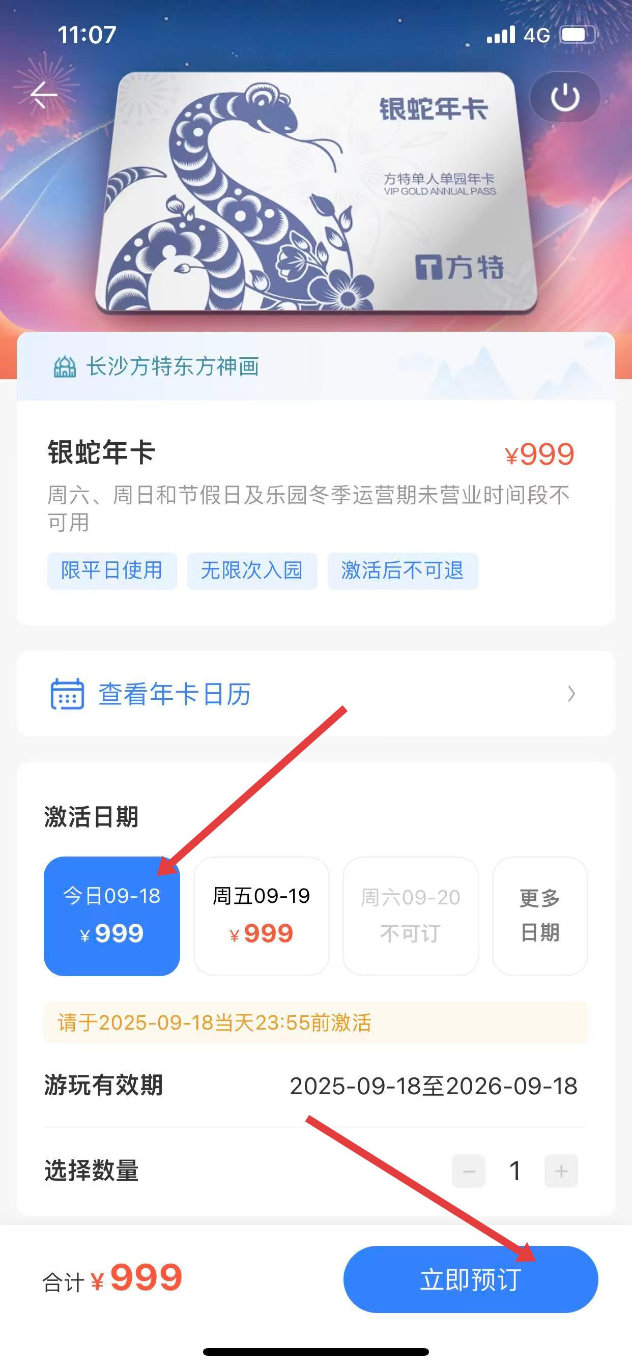 3、在年卡詳情頁(yè)面,選擇激活日期,確認(rèn)游玩有效期和購(gòu)買(mǎi)數(shù)量后,點(diǎn)擊立即預(yù)訂。