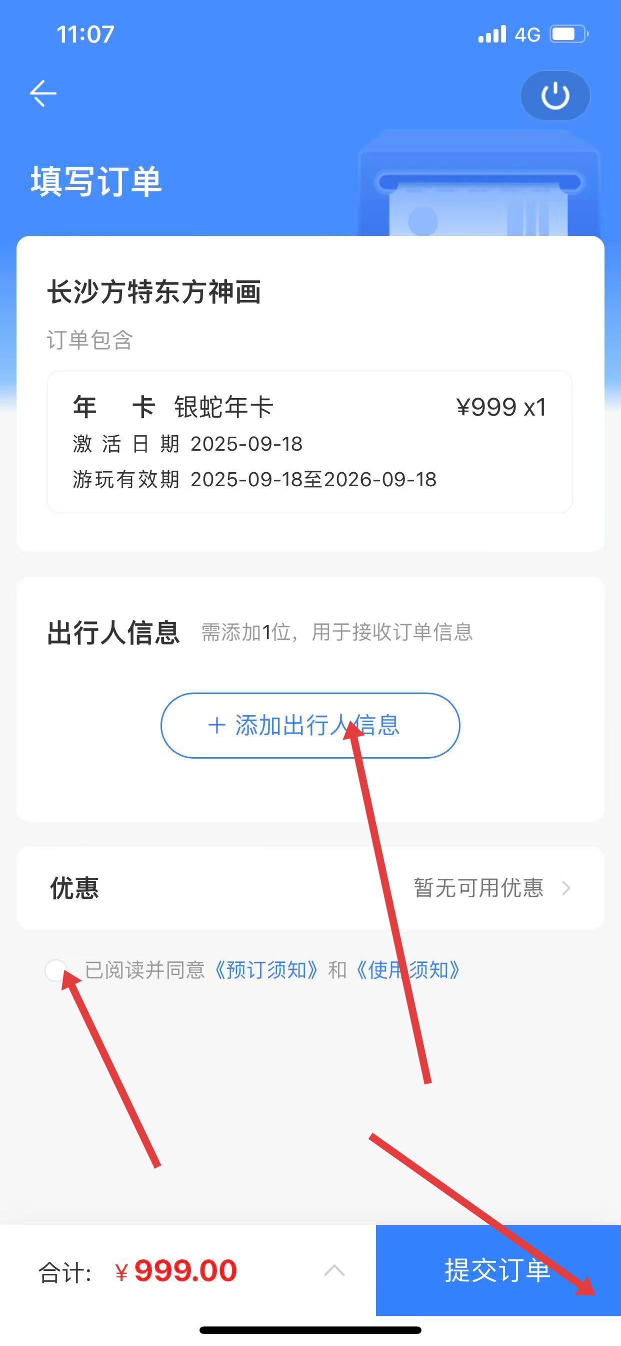 4、在填寫(xiě)訂單頁(yè)面,點(diǎn)擊添加出行人信息,填寫(xiě)相關(guān)信息,勾選同意預(yù)訂須知和使用須知,點(diǎn)擊提交訂單完成購(gòu)買(mǎi)。