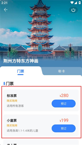 4、在門(mén)票頁(yè)面查看標(biāo)準(zhǔn)票、小童票等票價(jià)信息,可點(diǎn)擊對(duì)應(yīng)預(yù)訂按鈕進(jìn)行購(gòu)票。