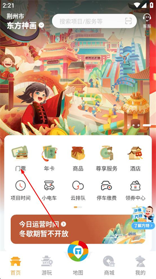 2、選擇荊州后,頁(yè)面展示荊州方特東方神畫(huà)相關(guān)內(nèi)容,進(jìn)入應(yīng)用主界面。