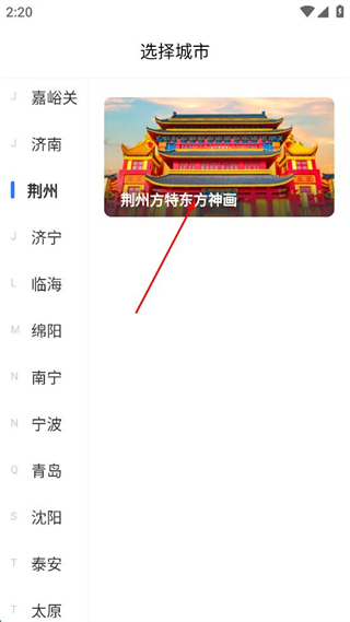 1、打開(kāi)方特應(yīng)用進(jìn)入選擇城市頁(yè)面,查看城市列表,找到并點(diǎn)擊荊州選項(xiàng)。