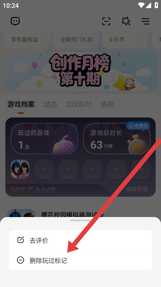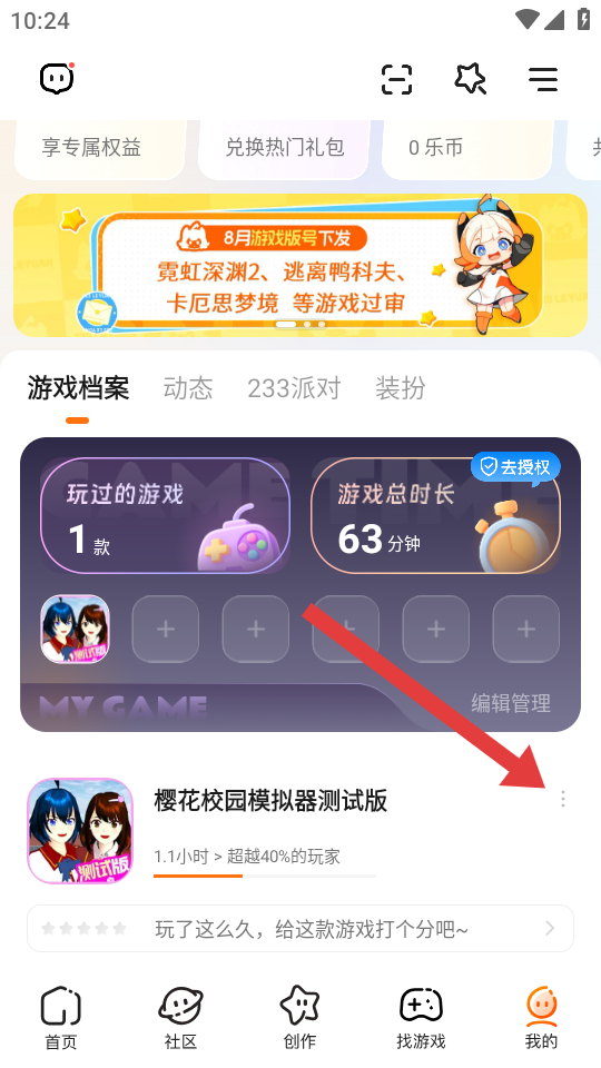 1、進(jìn)入233樂園我的頁面,在游戲檔案列表中找到要?jiǎng)h除記錄的游戲,點(diǎn)擊該游戲右側(cè)的菜單按鈕。