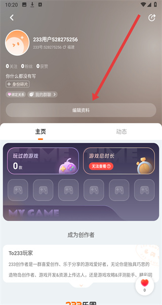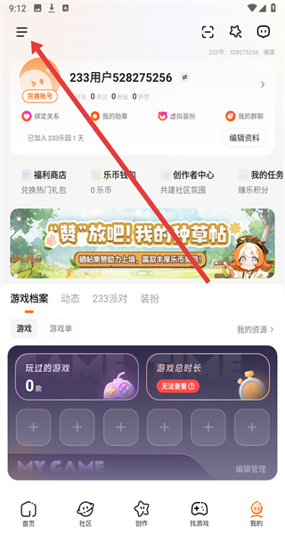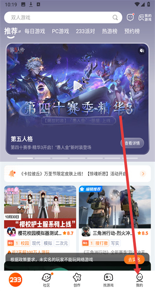 1、在233樂園APP首頁點(diǎn)擊右下角“我的”,進(jìn)入個(gè)人頁面。