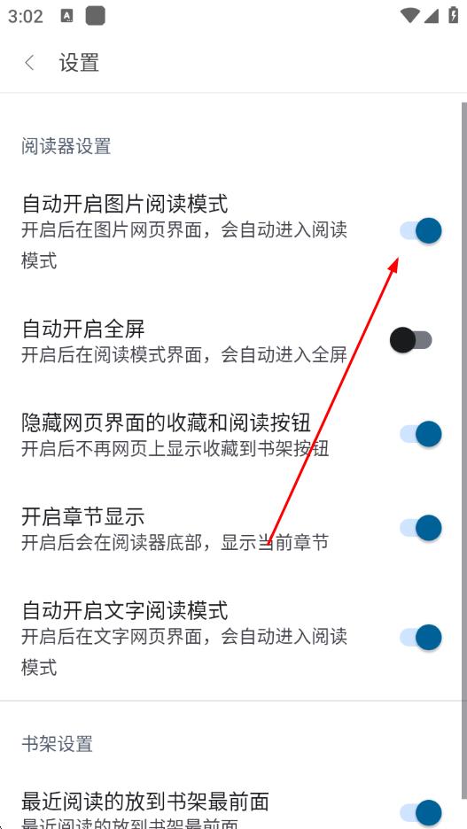 4、點(diǎn)擊自動(dòng)開(kāi)啟圖片閱讀模式等相關(guān)開(kāi)關(guān)選項(xiàng),屬于閱搜相關(guān)的設(shè)置優(yōu)化。
