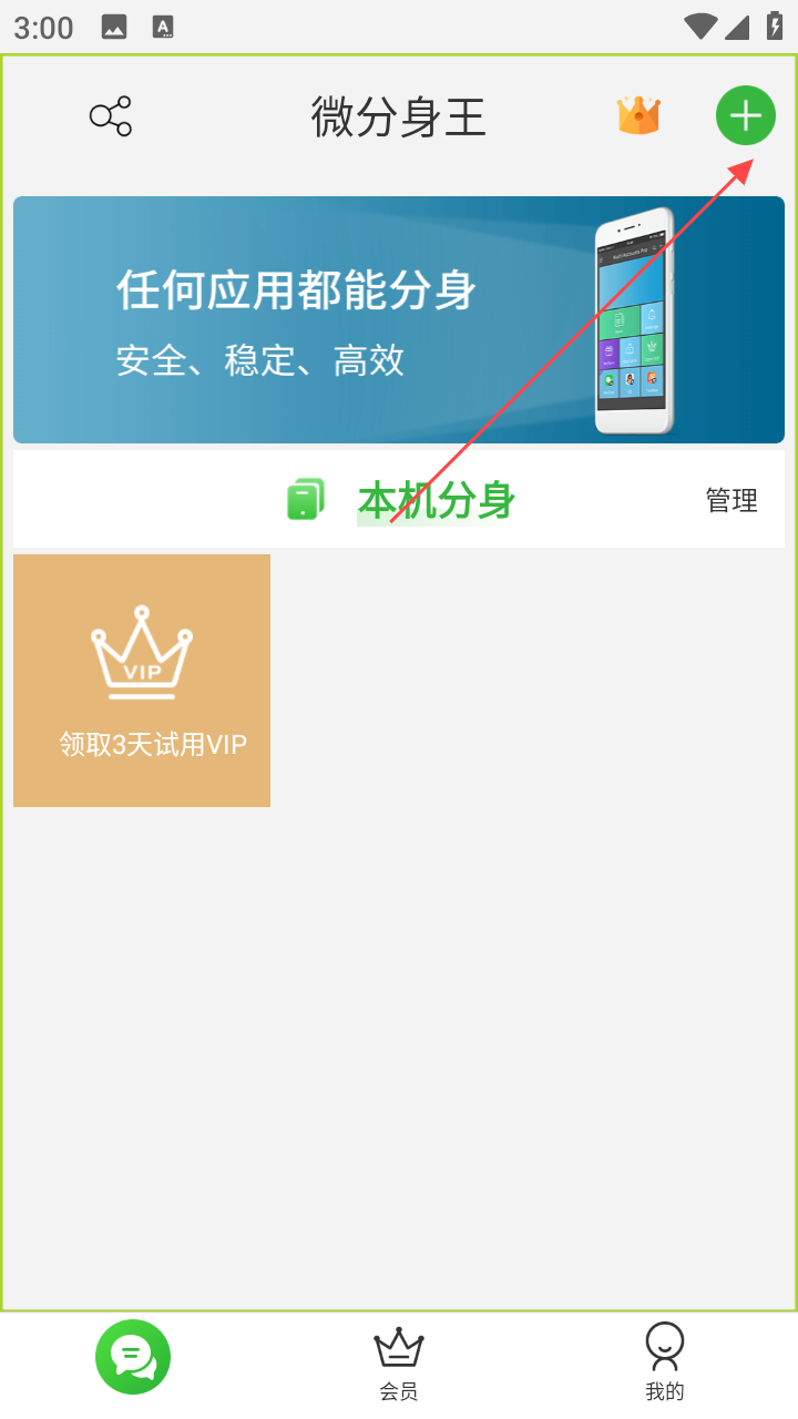 1、打開(kāi)微分身王軟件,點(diǎn)擊界面右上角綠色+按鈕,進(jìn)入添加分身界面,準(zhǔn)備進(jìn)行應(yīng)用分身操作。