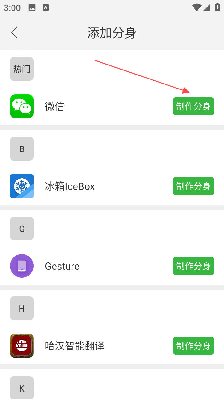 2、在添加分身界面,找到想要分身的應(yīng)用,比如微信,點(diǎn)擊應(yīng)用右側(cè)的制作分身按鈕,等待軟件完成應(yīng)用分身制作。