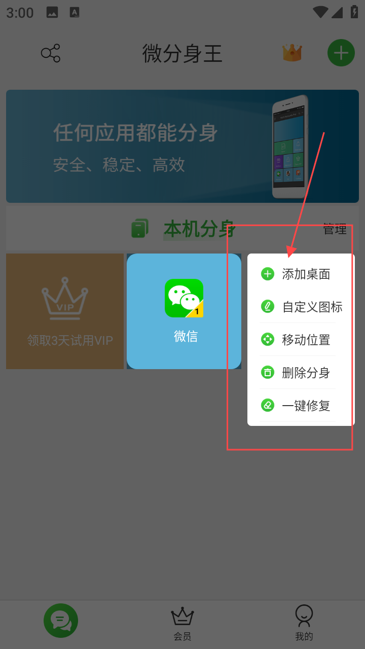 3、分身制作完成后,返回微分身王主界面,長(zhǎng)按分身應(yīng)用圖標(biāo),在彈出菜單中可選擇添加到桌面、自定義圖標(biāo)、移動(dòng)位置、刪除分身或一鍵修復(fù)等操作,方便管理和使用應(yīng)用分身。