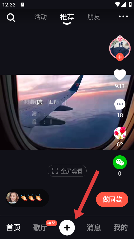 1、在音畫主界面,點擊底部導航欄中間的白色+號按鈕,進入創(chuàng)作功能選擇頁面。