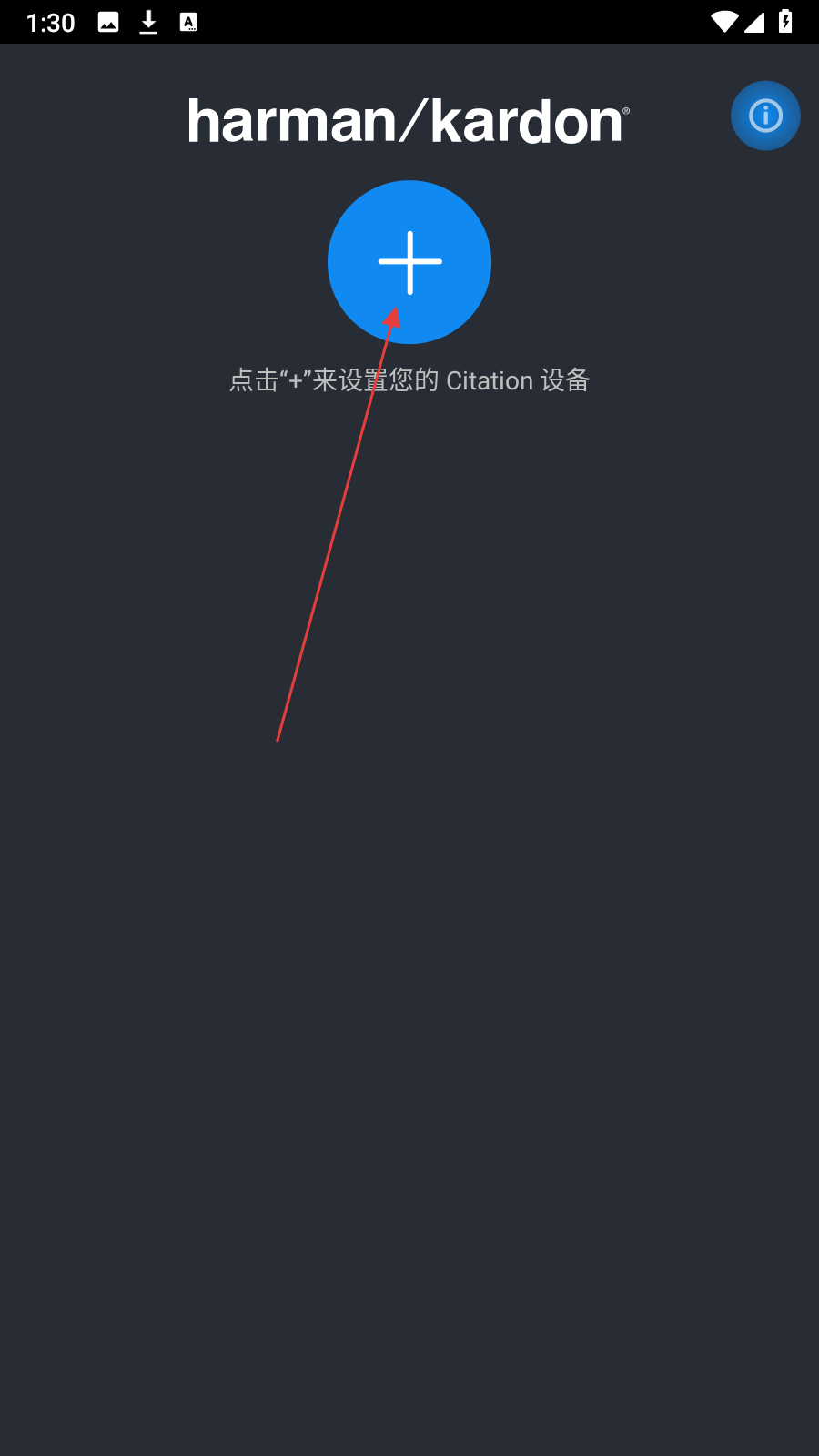 1、打開哈曼卡頓應(yīng)用,點(diǎn)擊界面中間藍(lán)色+按鈕,進(jìn)入設(shè)備連接流程。
