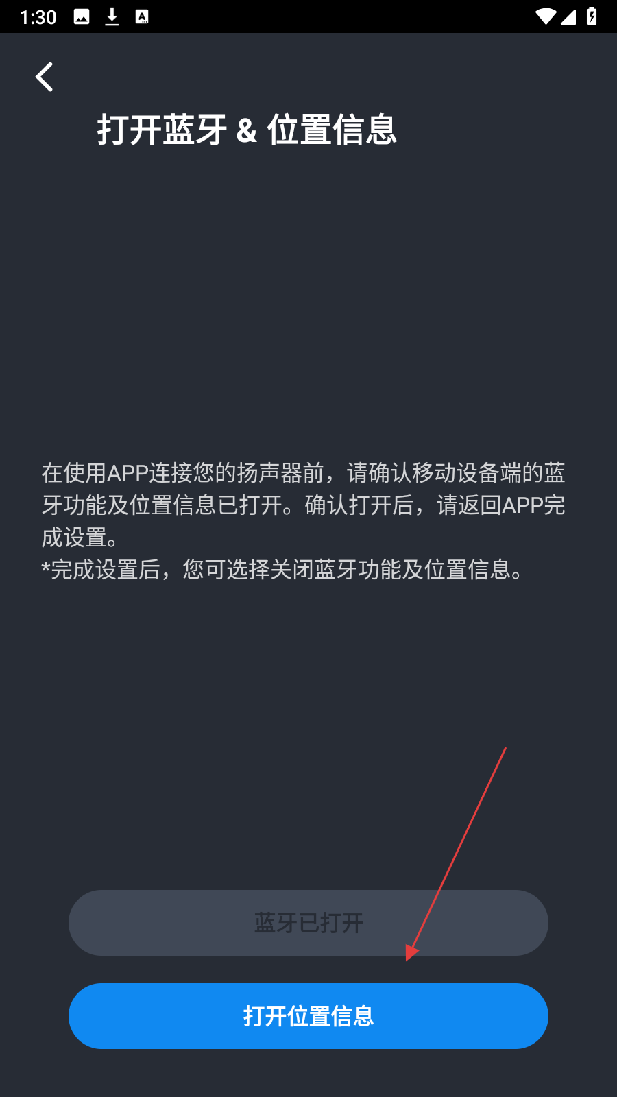 2、在打開藍(lán)牙&位置信息頁面,點(diǎn)擊打開位置信息按鈕,確保藍(lán)牙和位置信息處于開啟狀態(tài)。
