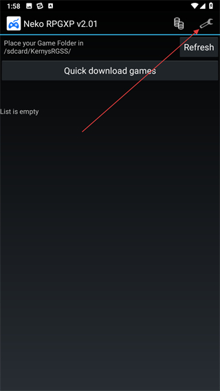 1、打開Neko RPGXP應(yīng)用,在主界面點(diǎn)擊右上角的扳手圖標(biāo)。