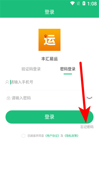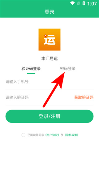 1、在豐匯易運(yùn)app登錄頁(yè)面,點(diǎn)擊密碼登錄選項(xiàng),進(jìn)入密碼登錄界面。
