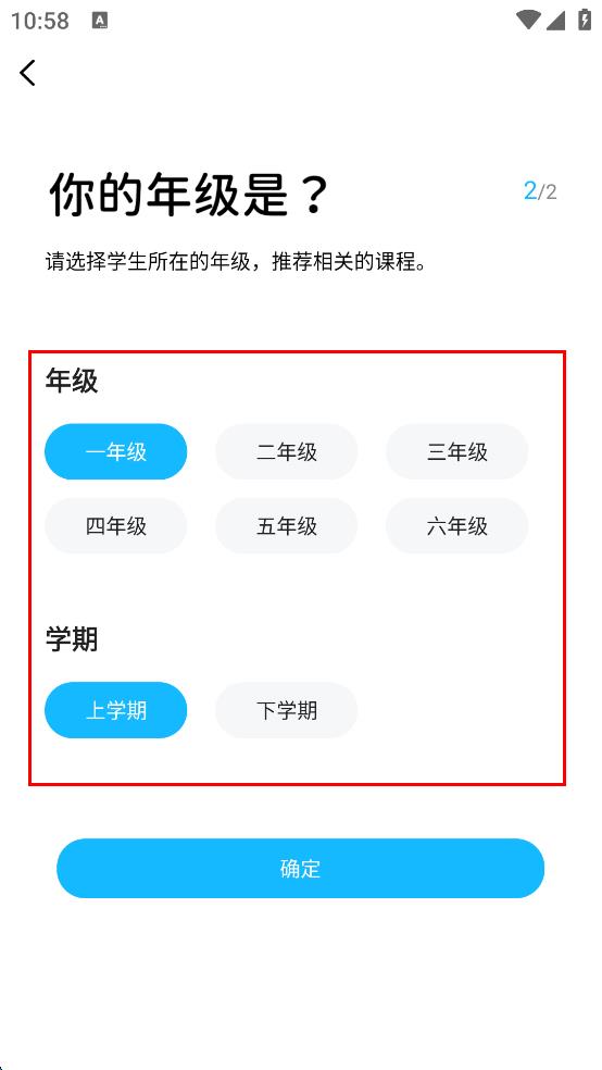 4、注冊完成后,進(jìn)入年級選擇頁面,根據(jù)學(xué)生情況選擇對應(yīng)的年級以及學(xué)期,選好后點(diǎn)擊“確定”按鈕,即可完成年級選擇。