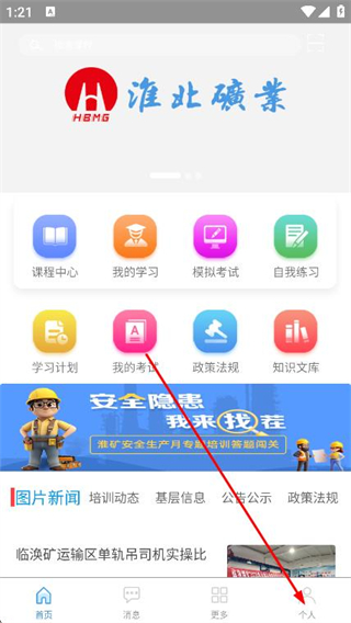 1、打開淮礦培訓(xùn)app,點(diǎn)擊底部導(dǎo)航欄中的個(gè)人。