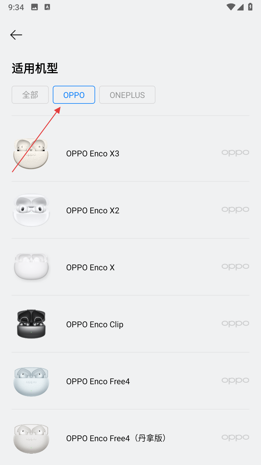 3、進(jìn)入支持的設(shè)備列表頁(yè)面后,點(diǎn)擊OPPO標(biāo)簽,可查看OPPO品牌下支持的耳機(jī)型號(hào)。