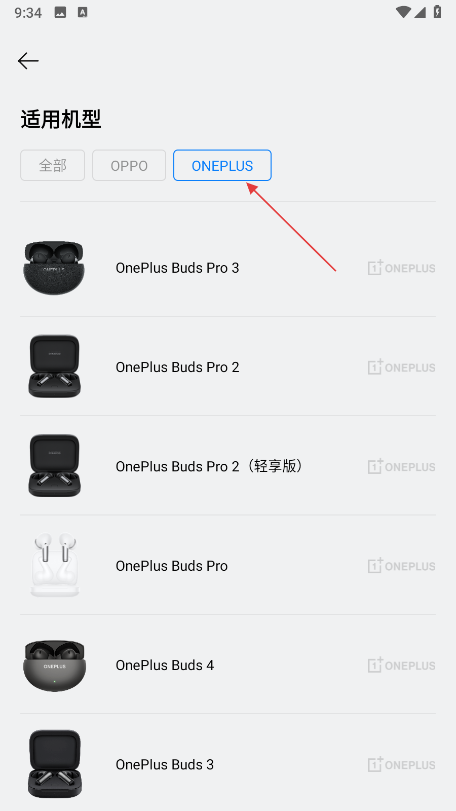 4、點(diǎn)擊ONEPLUS標(biāo)簽,可查看一加品牌下支持的耳機(jī)型號(hào)。