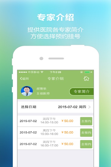 【掛號功能】提供本院全部科室普通門診和專家門診的預約掛號、實時掛號和實時叫號功能,患者只需一部手機,即可完成預約掛號并且可以隨時隨地查看叫號情況。