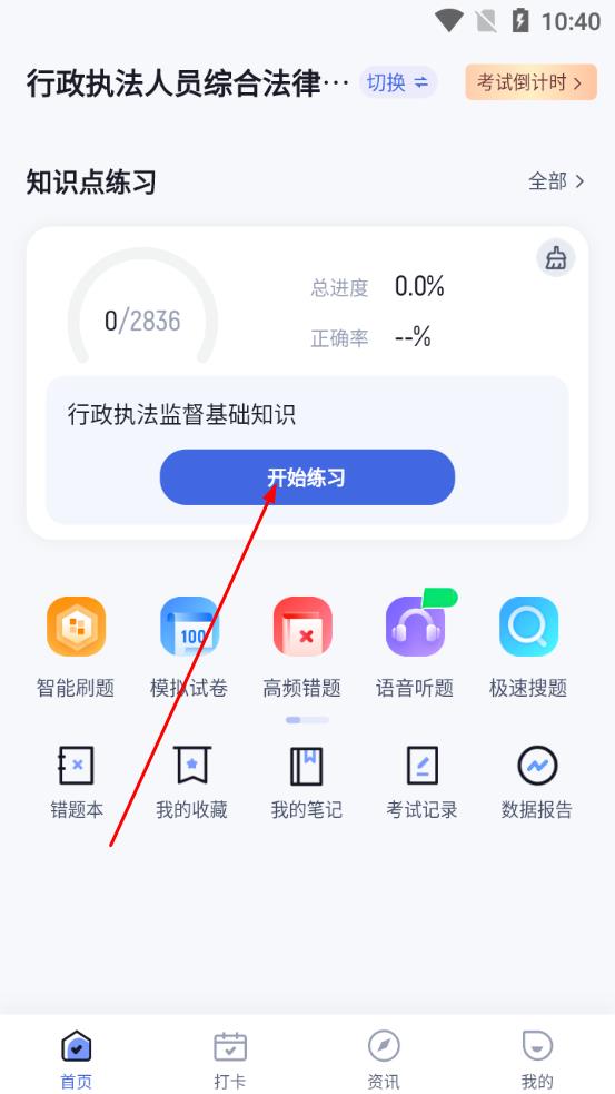 1、打開(kāi)行政執(zhí)法資格考試聚題庫(kù)App,在首頁(yè)選擇想要練習(xí)的科目,點(diǎn)擊開(kāi)始練習(xí)按鈕。