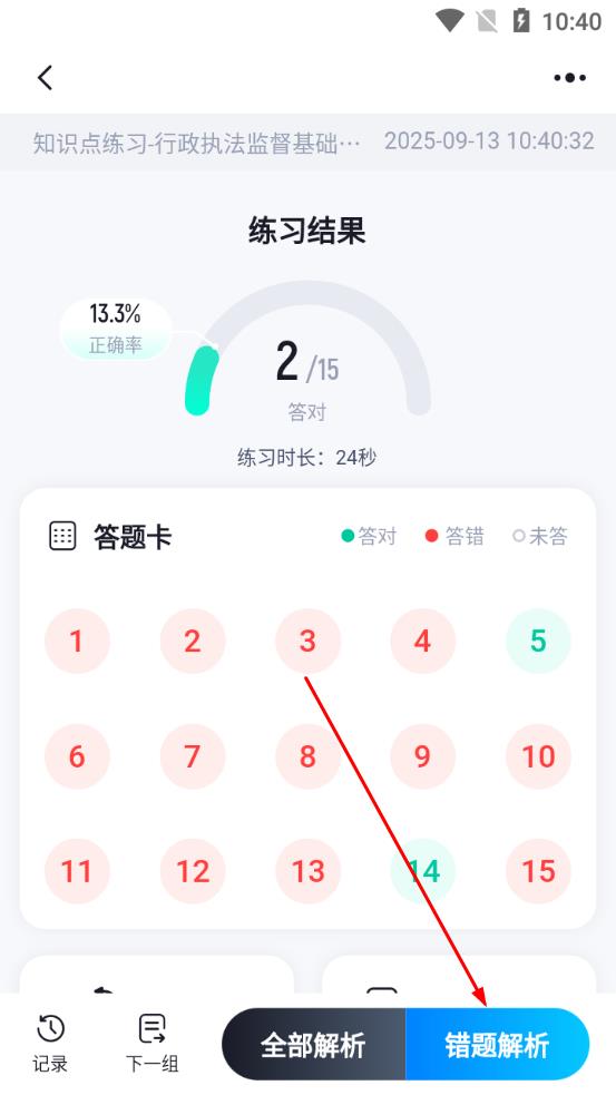 3、完成一組題目練習(xí)后,頁(yè)面會(huì)顯示練習(xí)結(jié)果,點(diǎn)擊錯(cuò)題解析按鈕。