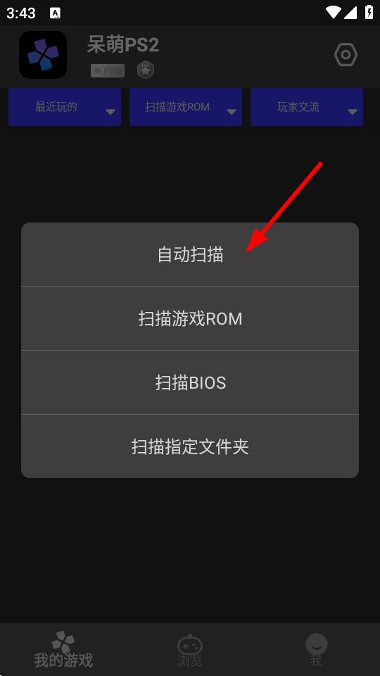 3、在彈出的菜單里,選擇自動掃描選項(xiàng),模擬器開始掃描游戲文件。