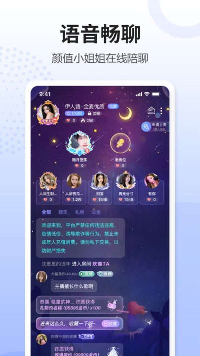 聊天室全天開(kāi)放,優(yōu)質(zhì)體驗(yàn),專(zhuān)屬待遇,更有情感電臺(tái),聊天交友,歌手點(diǎn)唱實(shí)時(shí)在線互動(dòng)。