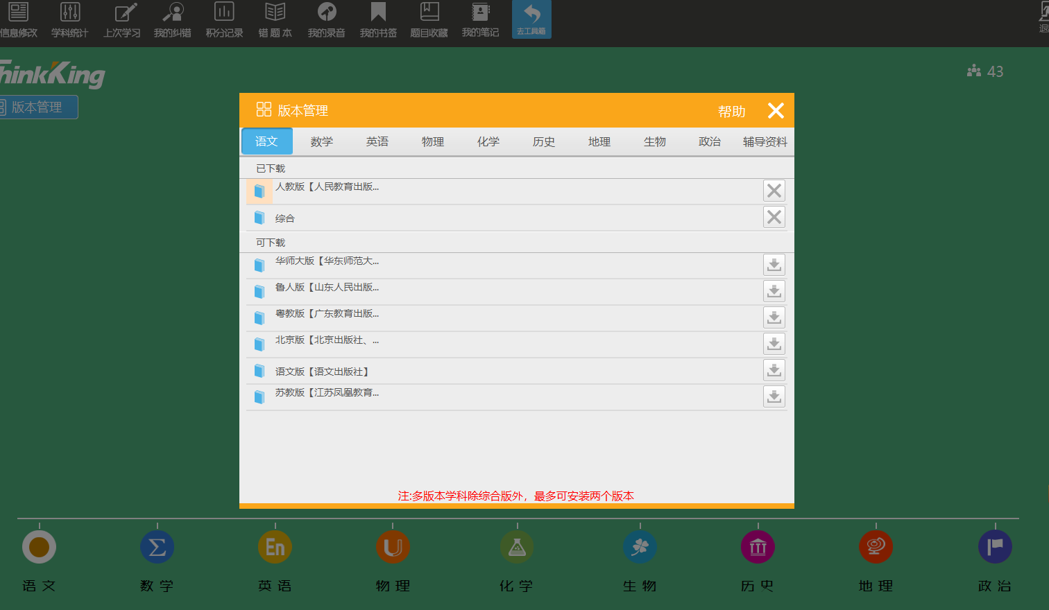 提供全國范圍內(nèi)的幾十個版本的配套同步教材,并可通過“版本管理”模塊便捷的進行下載、安裝、使用、更換和卸載。