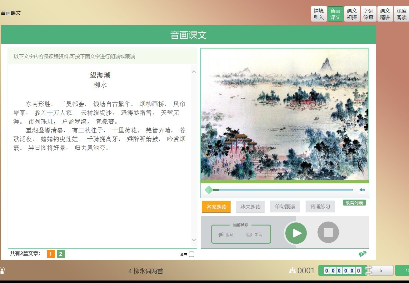 進一步優(yōu)化了多媒體朗讀功能:語文、英語的音畫課文、古詩詞名篇背誦等模塊實現(xiàn)個性化的朗讀、跟讀、背誦功能。2014版新增了錄音導出等錄音管理功能。