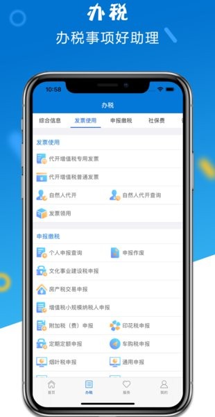 涉稅業(yè)務(wù)辦理的集中區(qū)域,包含綜合信息報(bào)告、發(fā)票使用、稅費(fèi)申報(bào)及繳納、稅收減免等功能。
