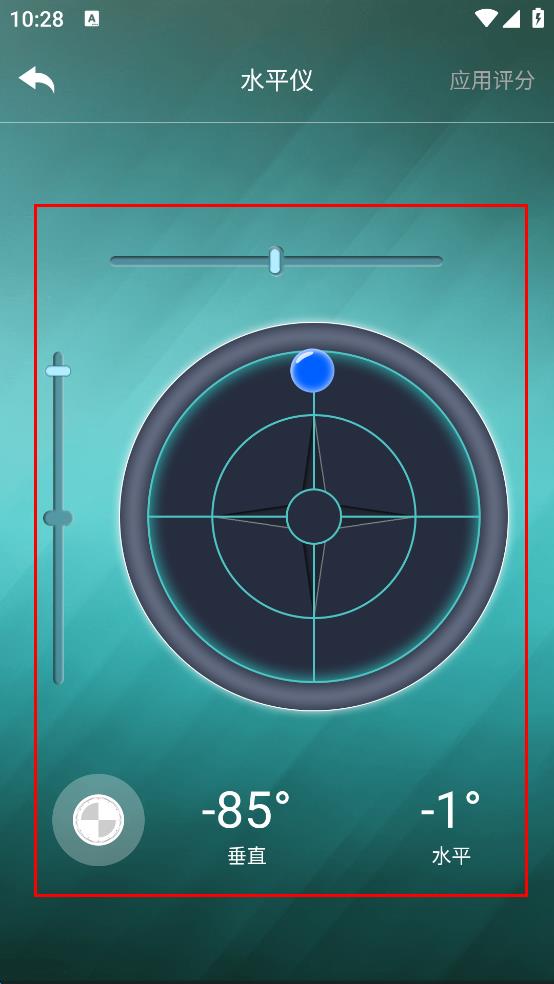 2、將設(shè)備放置在需要測量的物體上,觀察水平儀界面的藍色球體和角度數(shù)值。