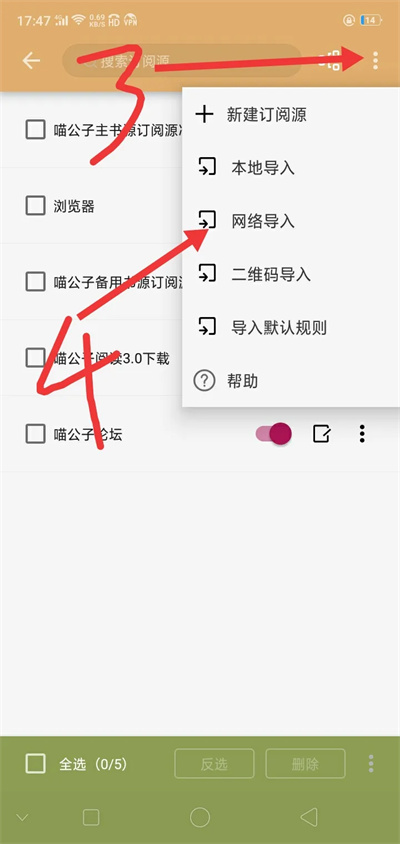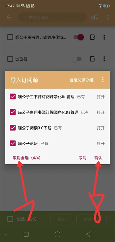 4、接著我們?nèi)x導(dǎo)入到訂閱源中即可,還可以自定義源分組方便自己找到這個加入的源就行;