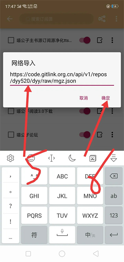 3、這里就要輸入可以導(dǎo)入的書源網(wǎng)址了(小編放在回答的開頭了哦),復(fù)制粘貼進(jìn)去后點(diǎn)擊確認(rèn)即可;