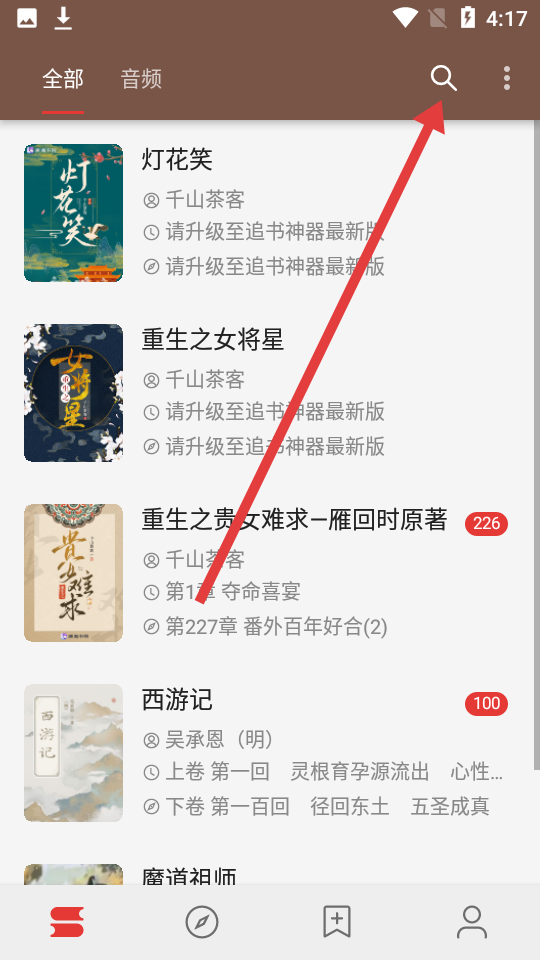 1、打開酷安閱讀書架頁,點(diǎn)擊右上角放大鏡進(jìn)入搜索。