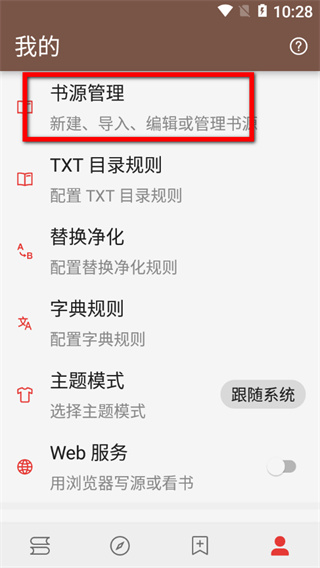 1、在閱讀APP我的頁面,點(diǎn)擊書源管理選項,進(jìn)入書源管理頁面。