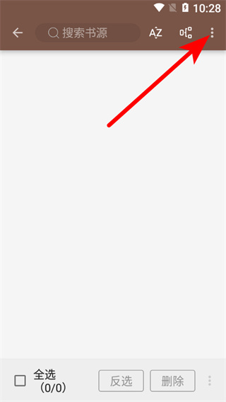 2、在書源管理頁面,點(diǎn)擊右上角三點(diǎn)圖標(biāo),展開功能菜單。