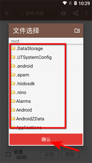 4、在文件選擇界面,選擇書源文件后點(diǎn)擊確認(rèn),完成書源導(dǎo)入操作。
