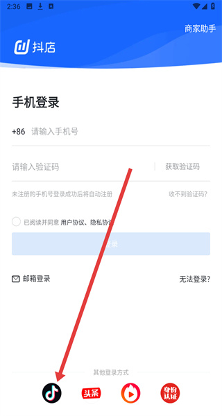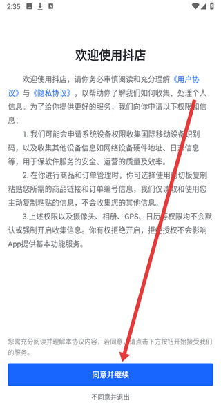 1、點擊“歡迎使用抖店”頁面的“同意并繼續(xù)”,進入登錄界面。