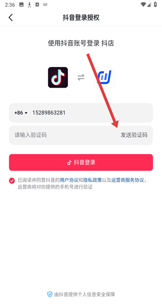 3、在抖音登錄授權頁面填寫好手機號后點擊“發(fā)送驗證碼”,獲取并輸入短信驗證碼。