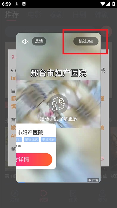 1、確保我們手機(jī)上的泰劇兔是正版的軟件,然后打開軟件進(jìn)入到首頁之中,會(huì)看到有一個(gè)廣告彈窗,不需要等待數(shù)秒結(jié)束,就可以直接【點(diǎn)擊跳過】跳過廣告;