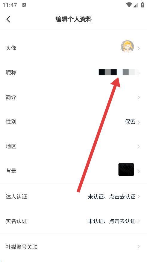 3、進(jìn)入編輯個(gè)人資料頁面后,找到并點(diǎn)擊昵稱選項(xiàng)。